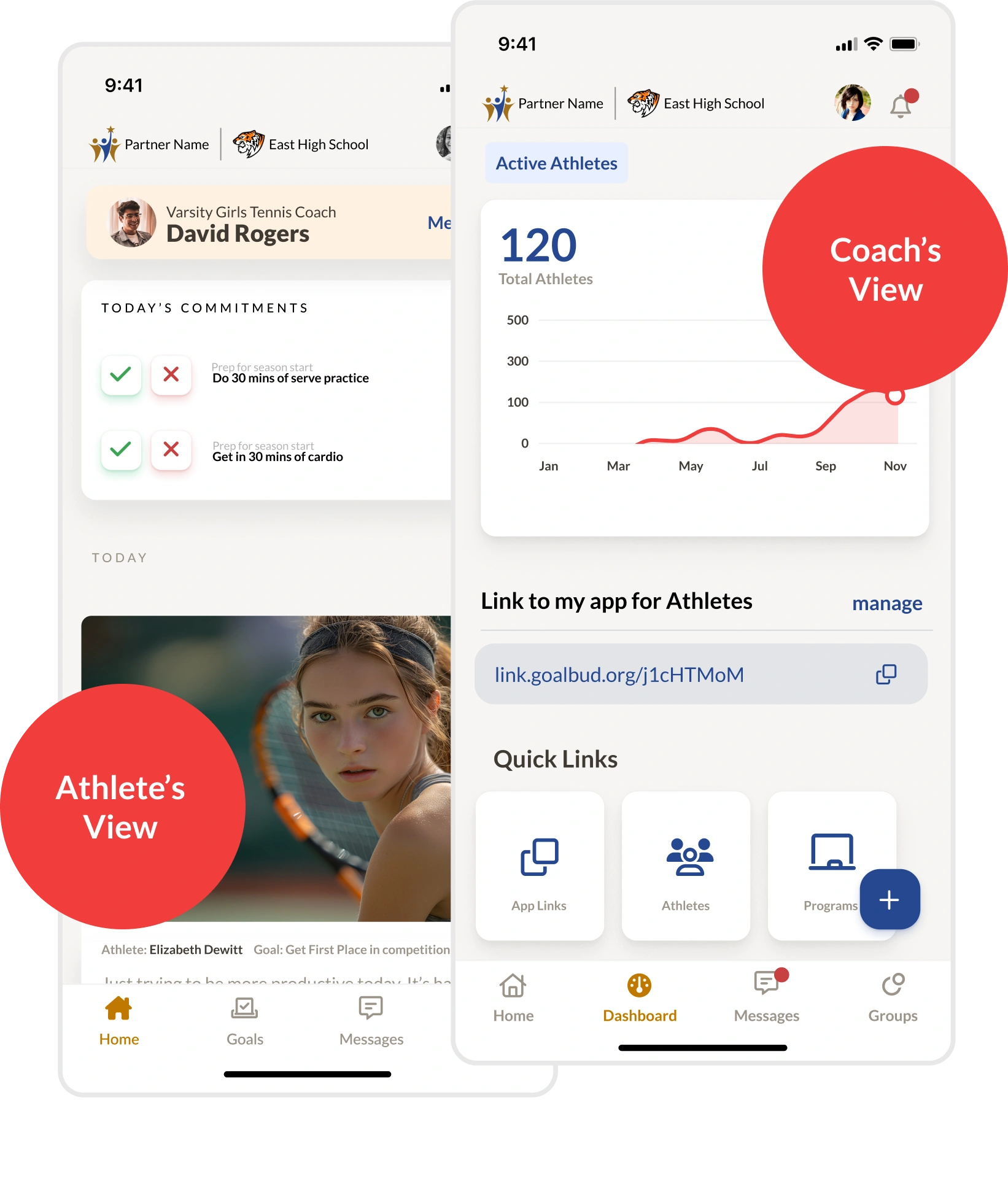 GoalBud "Coach" is the app for use by Athletic Directors, Coaches, and Assistant Coaches.